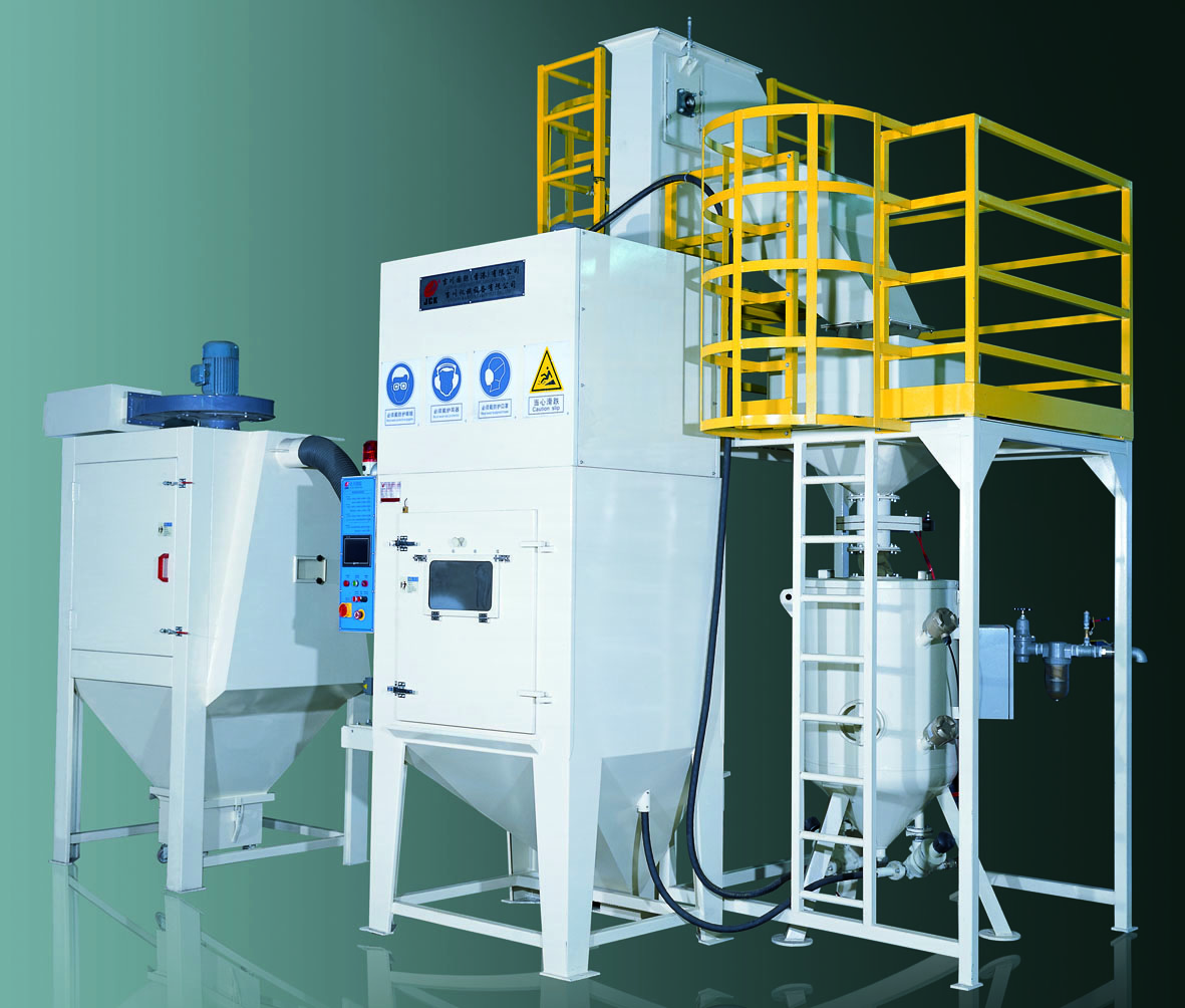 2?丸料和壓縮空氣的混合過程 丸料和壓縮空氣的三種常見的混合系統(tǒng)是虹吸式系統(tǒng)、重力式系統(tǒng)和直接供料系統(tǒng)。 2.1虹吸式系統(tǒng) 該系統(tǒng)如圖6所示。由于壓縮空氣的速度v2比丸料輸送管道中的速度v1大的多,那么丸料輸送管道中的空氣會(huì)被吸入到壓縮空氣管道中,這就是“虹吸”這個(gè)詞的來源。由于v1小于v2,那么丸料輸送管道的空氣壓力要高于噴嘴中的壓力。伯努利解釋了這種現(xiàn)象,因此也稱為伯努利定理。如果用p1表示丸料輸送系統(tǒng)中的壓力,用p2表示噴嘴中的壓力,那么我們可以得到: (p1-p2)=1/2.ρA.(v22-v12)?????? ?????????????????????(2)
